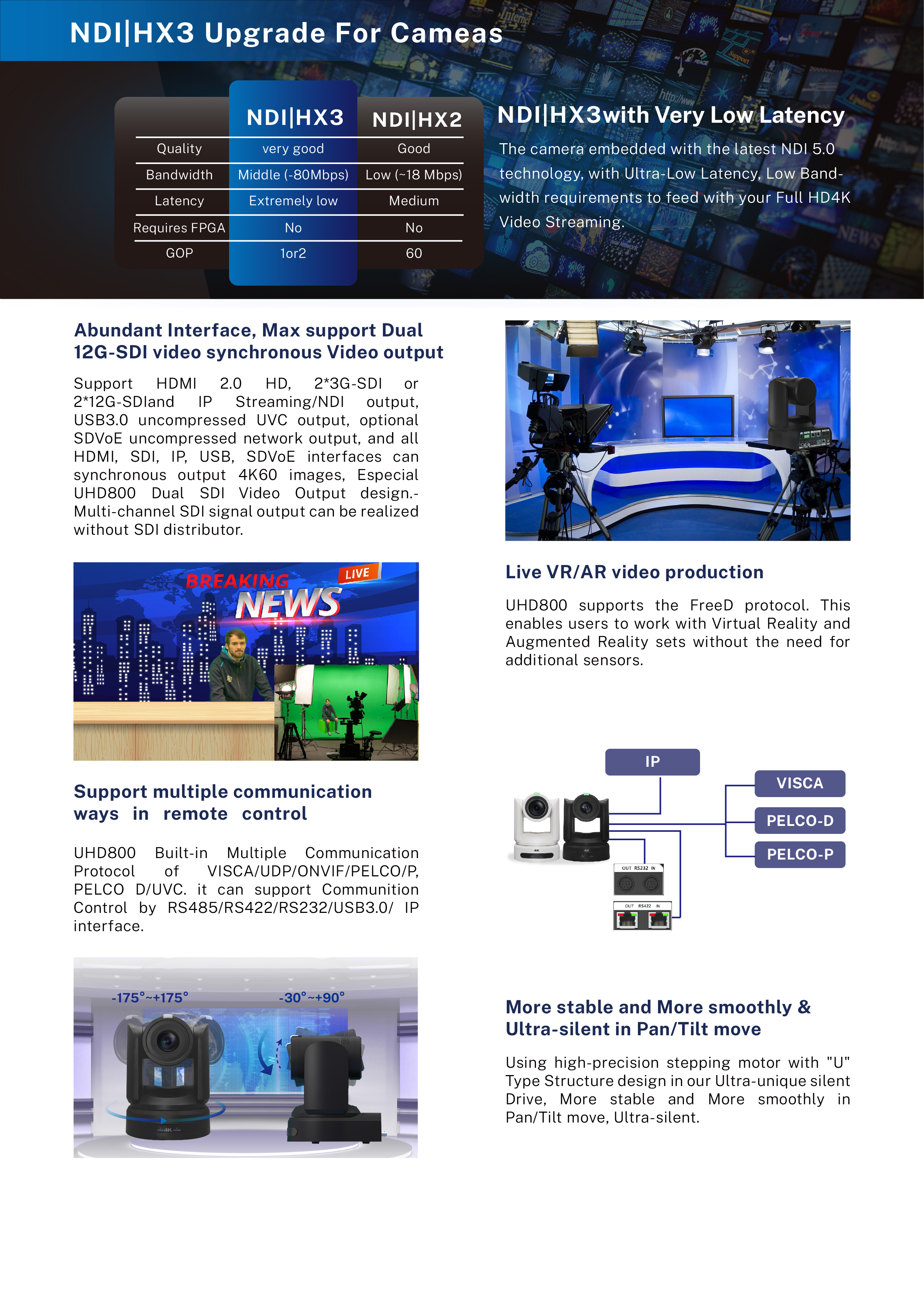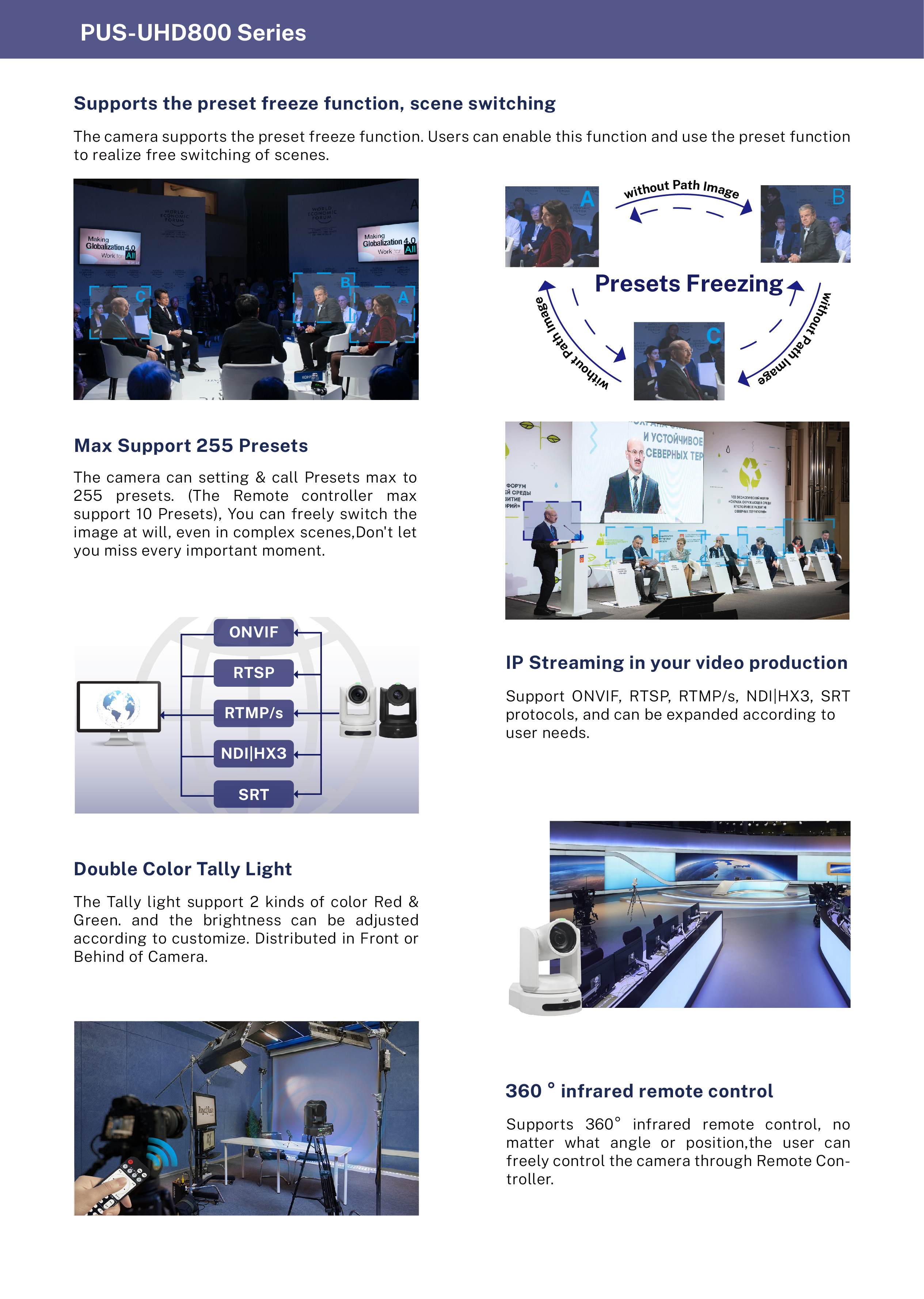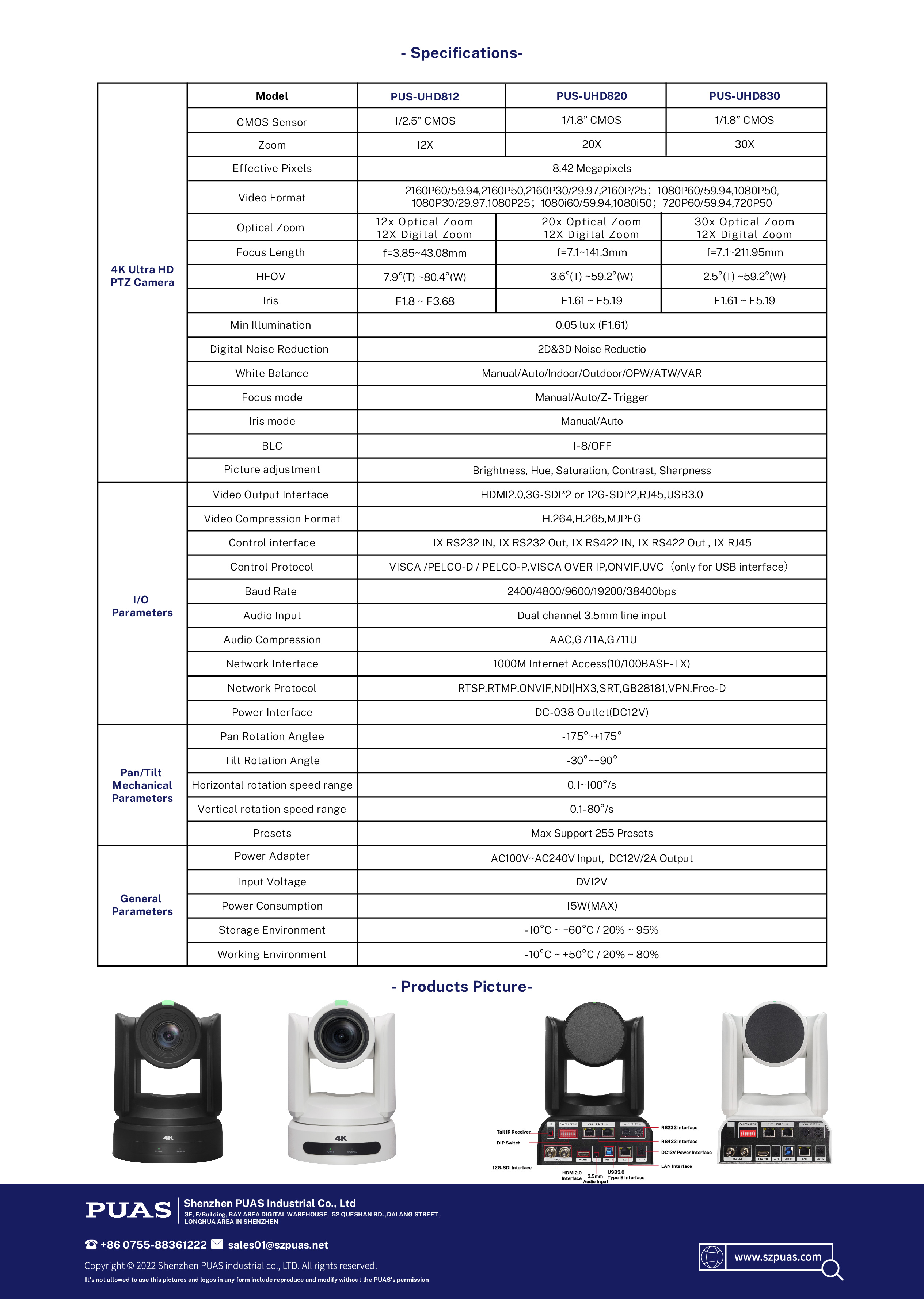 The PUAS PUS-UHD800 Series is a 4K Ultra HD broadcast-grade PTZ camera, engineered with integrated NDI® 5.0 technology and full support for the latest NDI®|HX3 protocol. It is available with 12x, 20x, or 30x optical zoom lenses to meet diverse production requirements.